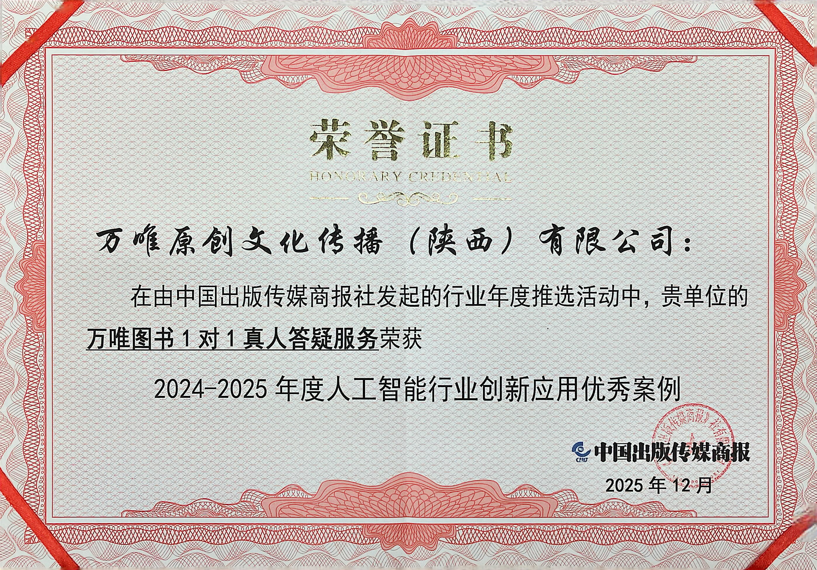 2025:万唯图书1对1真人答疑服务获人工智能行业创新应用优秀案例(2024-2025年度)