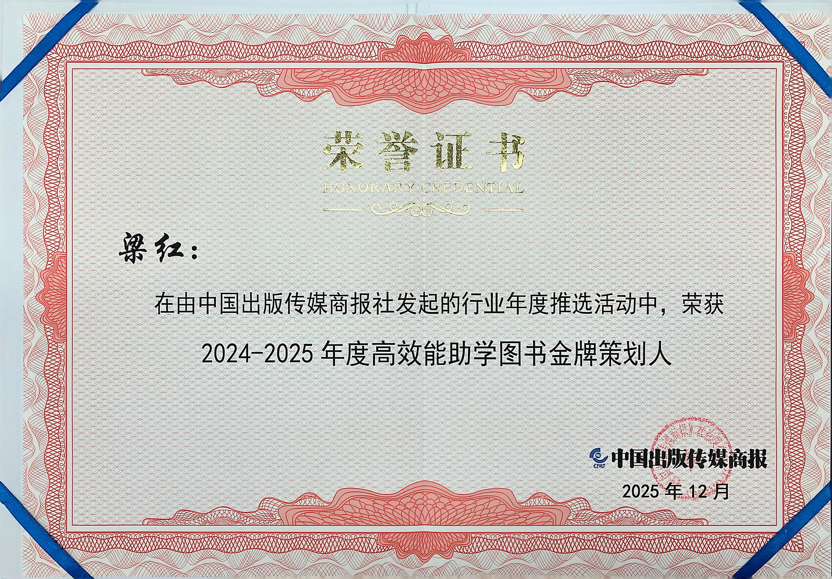 2025:梁红获高效能助学图书金牌策划人(2024-2025年度)